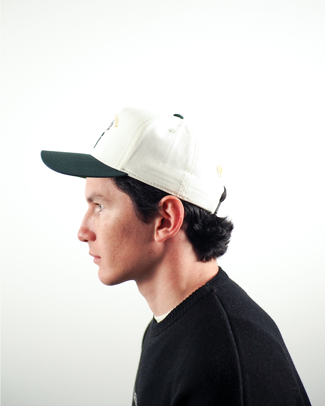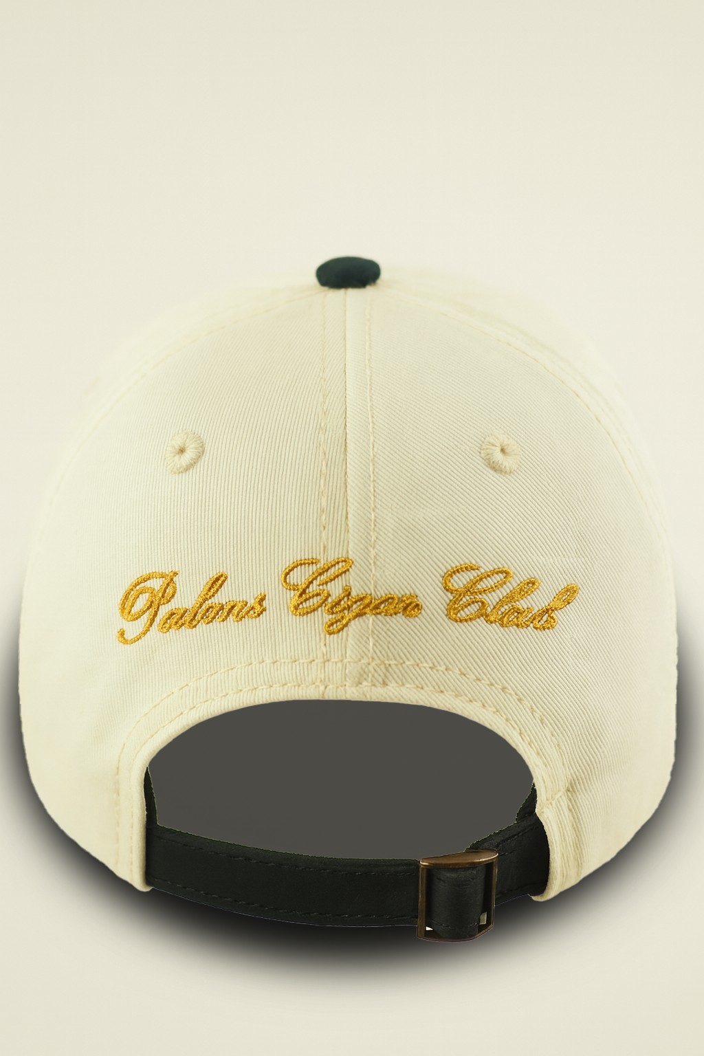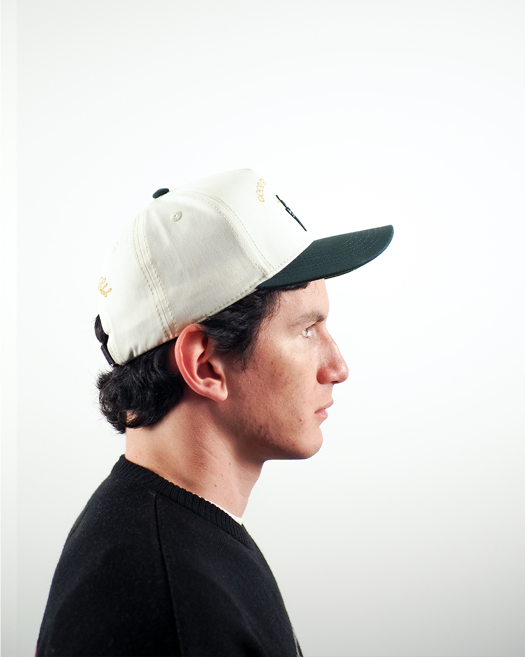 Gorra en drill Diseño bordado Correa en cuero negro 6 paneles Visera en drill color verde pino Cabecera en drill col...