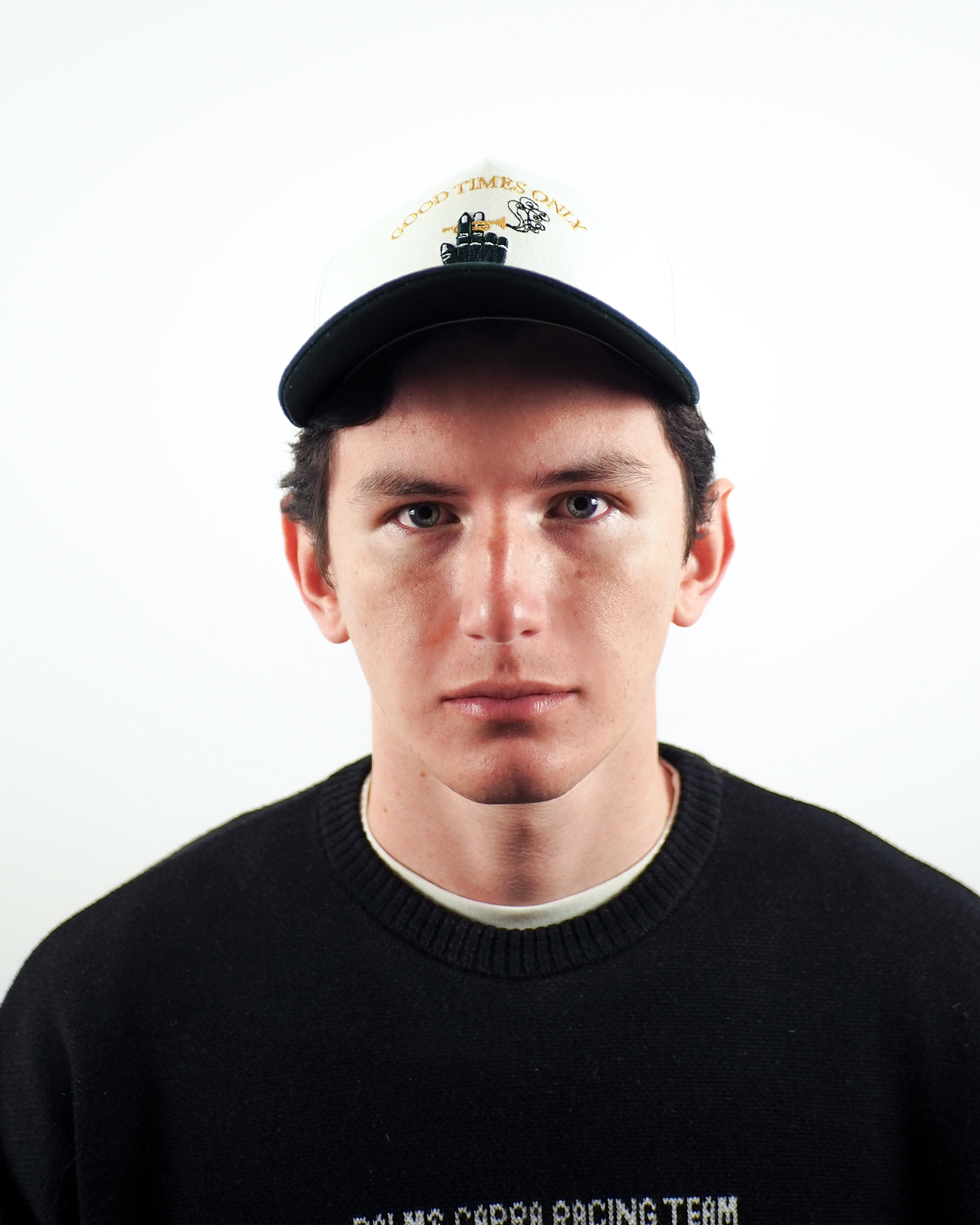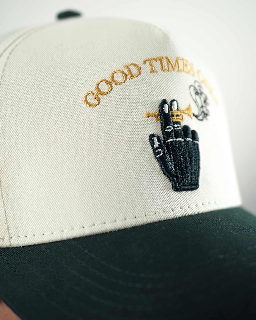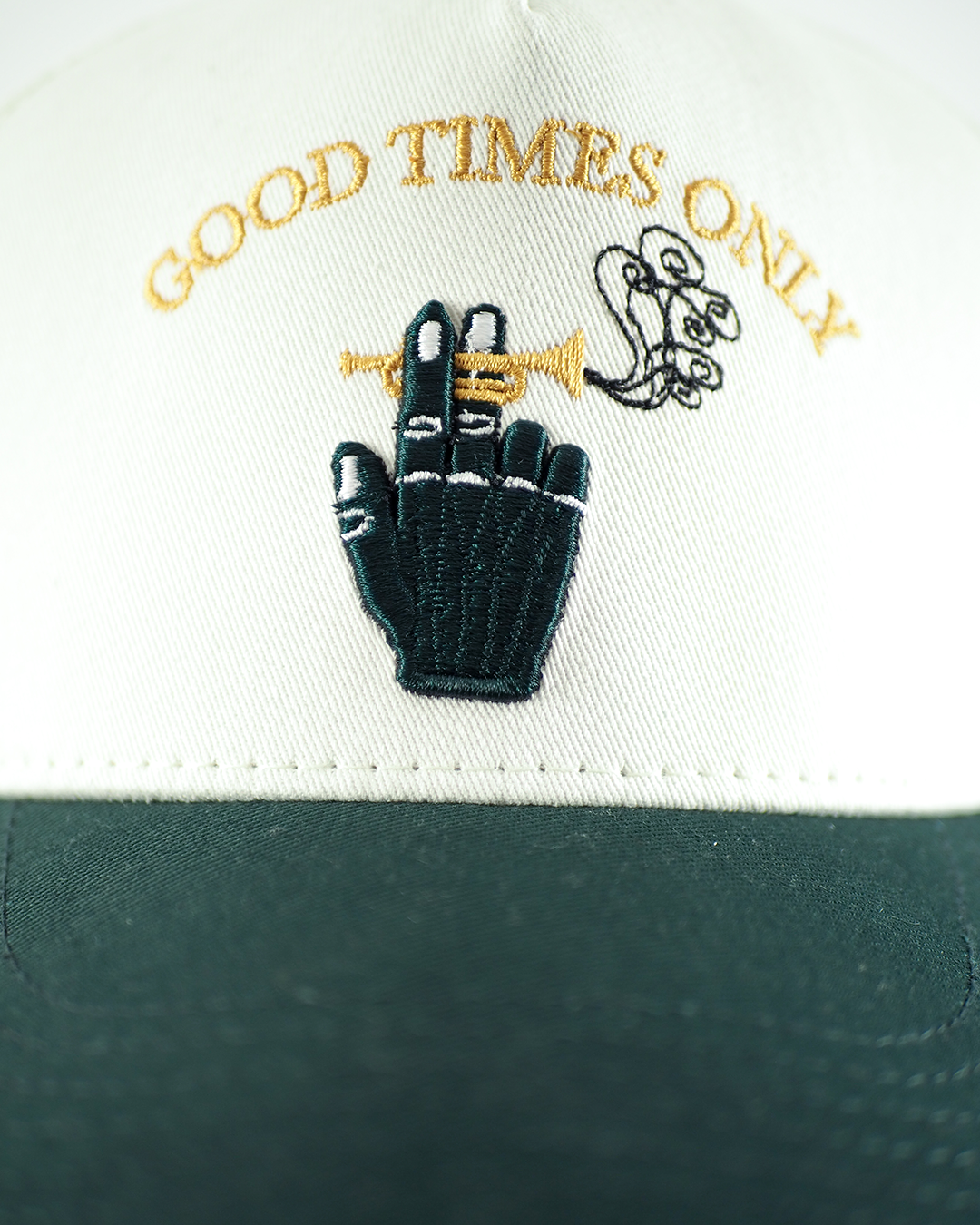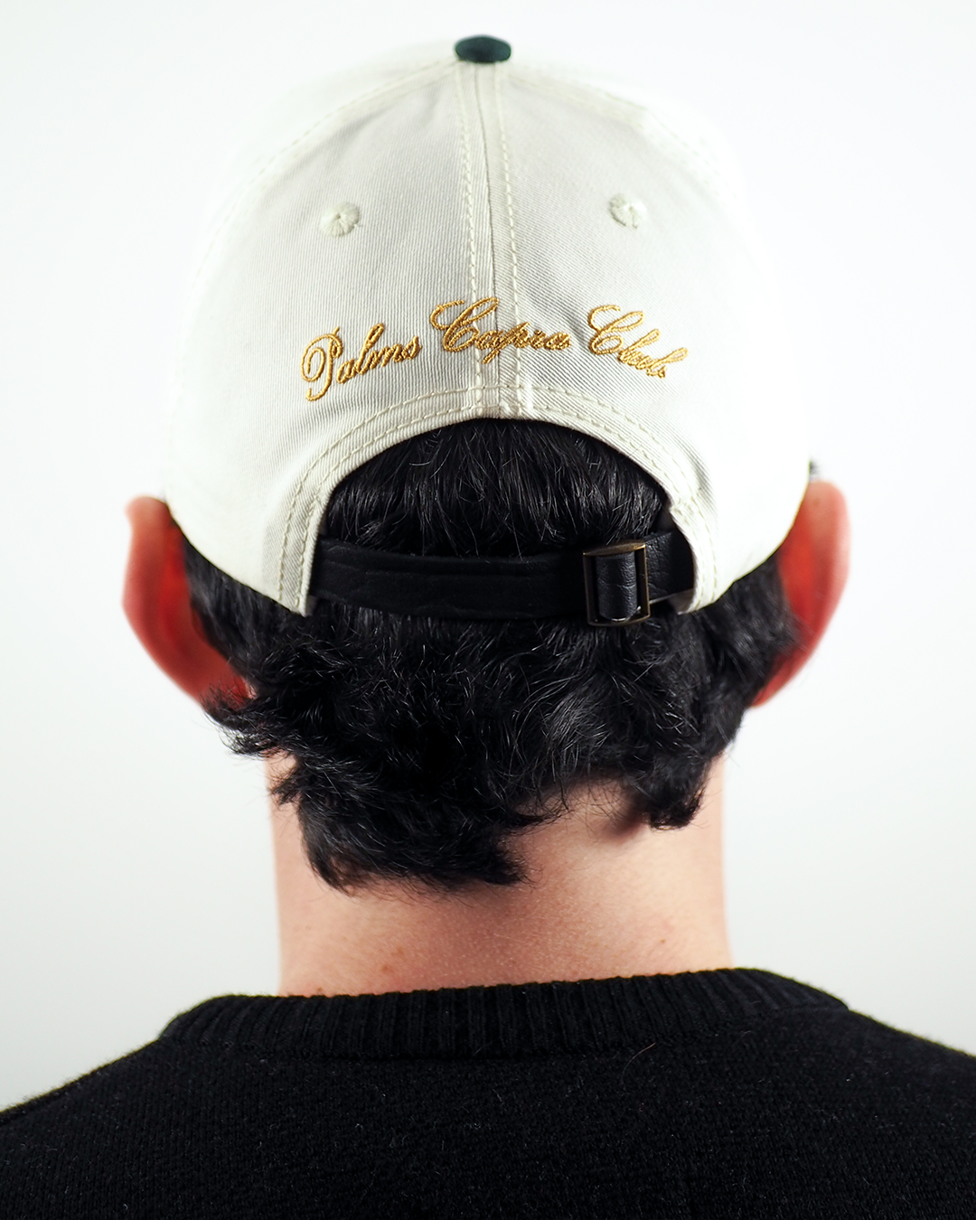 Gorra en drill Diseño bordado Correa en cuero negro 6 paneles Visera en drill color verde pino Cabecera en drill col...